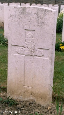 Arthur Johnson was killed on the 18th April 1917. The weather was bad like the previous day with rain, snow and sleet all day. The battery fired 212 rounds on the wire and trenches but observation and accurate registration was difficult. The gunners claimed to have seen several rounds fall in the enemy trenches and so the aim was taken as fairly accurate. Lt Hourihane even tried going out into No Man’s Land to set up an observation post, but the ground mist prevented observation. During the day and night the German counter battery work was again accurate and shells fell at frequent intervals during the day and night. One of these shells got the edge of No.4 gun platform and killed Gnrs Johnson and Smith (it is unusual for War Diaries to give names of other ranks, but these two soldiers are named).