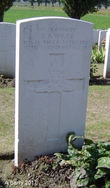 George was buried in Klein-Vierstraat British Cemetery, Belgium, along with the three sergeants from 123 Battery RFA that George died with - Sergeant 87266 Arthur Wilkinson, Sergeant 55108 Albert Victor Wilshaw aged 23 of Crosshaven, Cork and Sergeant 39624 Arthur W Dyer.