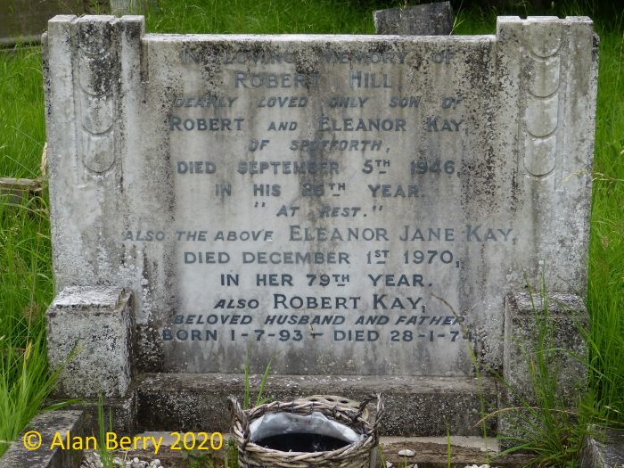 Unfortunately, Robert and Eleanor's son, Robert Hill Kay died in Harrogate General Hospital on the 5th September 1946 aged just 26 years old. He was buried in the cemetery of All Saint's Church, Spofforth.