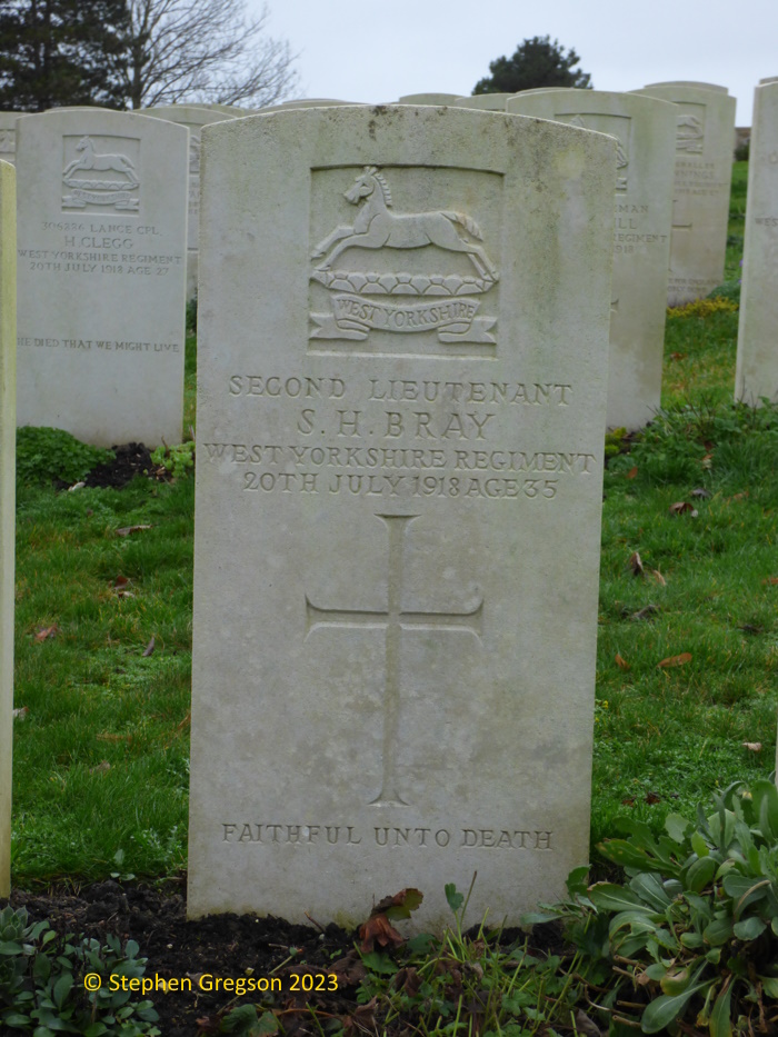 Sidney Bray's body was originally buried in Cuitron cemetery, but was later exhumed and re-buried in the Commonwealth War Grave cemetery in Marfaux, France.