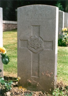 William Lee Stoker was killed in action on the 29th March 1918. Some confusion over the date of William's death arises because a number of documents from the Commonwealth War Grave Commission give William's date of death as 29th September 1918. However, given the dates of various newspaper articles (see below), this latter date must be wrong. According to the Commonwealth War Graves Commission, William's body was initially buried at a map reference of Q1.A.3.2 along with four unknown soldiers of the East Yorkshire Regiment. However this grave position raises a few more questions. It is marked by a red cross on Map 2, near Mailly Maillet. However, by the 29th the East Yorkshires were further south near Bouzincourt, as described. We will probably never know whether William was wounded on the 25th while they were close to Mailly Maillet and died on the 29th, whether a mistake was made with the date, or whether an aid post was stationed there where he was evacuated from the front on the 29th and where he died. After the war, a number of small burial sites were moved and the bodies exhumed and re-buried. William Lee Stoker is now buried in Hermies Hill British Cemetery, France.