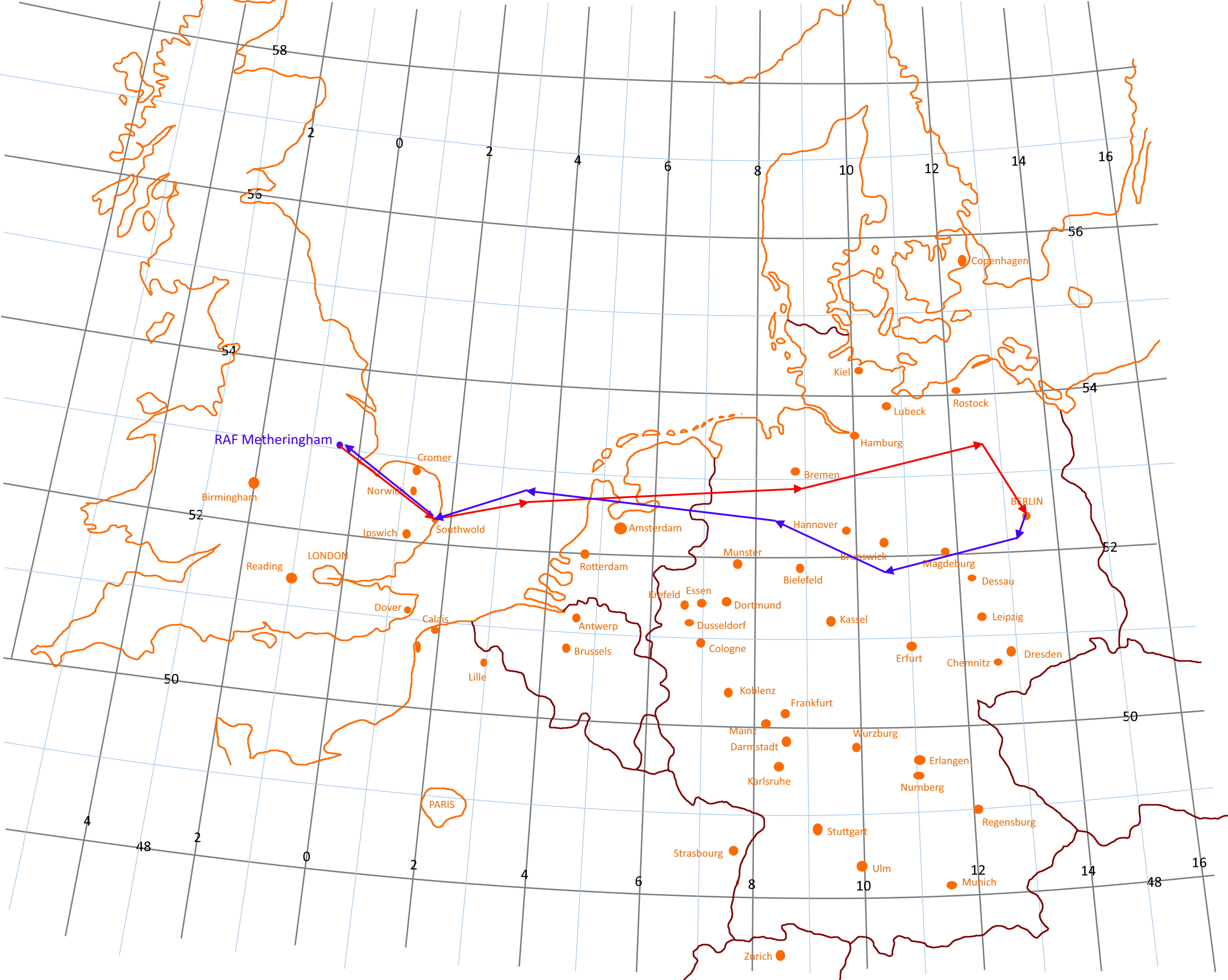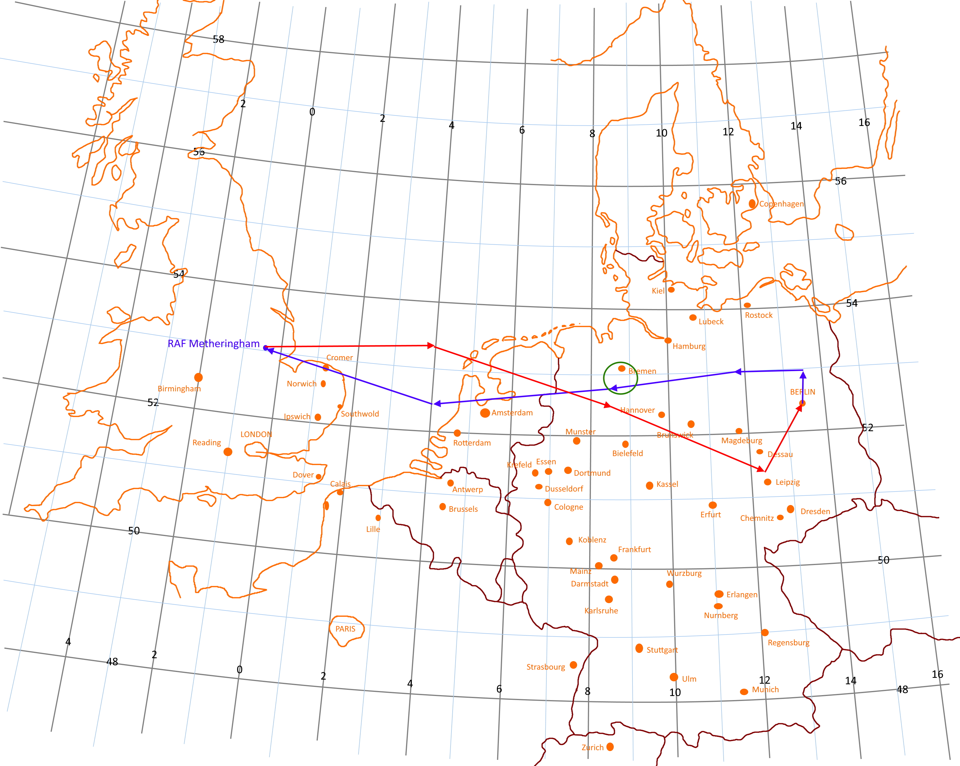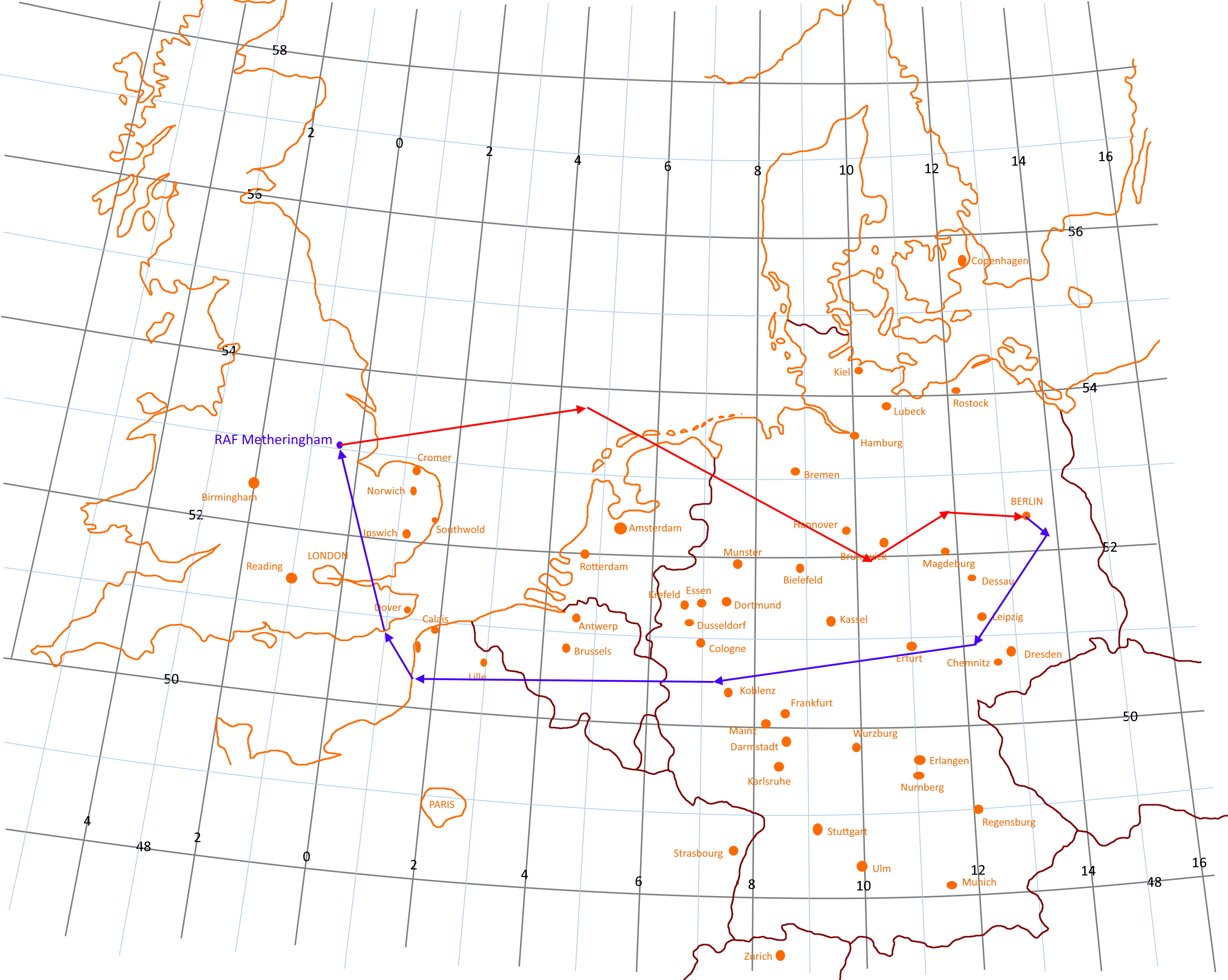 Sergeant John Harrison's first flights with 106 squadron took place in the first few weeks of December 1943. He flew on the 9th December for 1 hour and 15 minutes in Lancaster ZN-P practicing circuits and landing at the airfield in Metheringham. Then on the 10th training continued with bombing practice and an exercise homing using 'Gee'. On the 11th they flew practice cross country exercises. 2 hours 40 minutes in daylight flying using H2S from Metheringham to Norwich, Stoke, Cambridge and back to base; and then at night an exercise of 5 hours 10 minutes, again using H2S from Metheringham to Yeovil, Douglas, Cambridge and back to base. A further daylight cross country route from base to Peterborough, Bradford, Carlisle and home on the 13th December, was then followed by a fighter affiliation training exercise on the 18th December. The crew were then ready for their first operational mission.