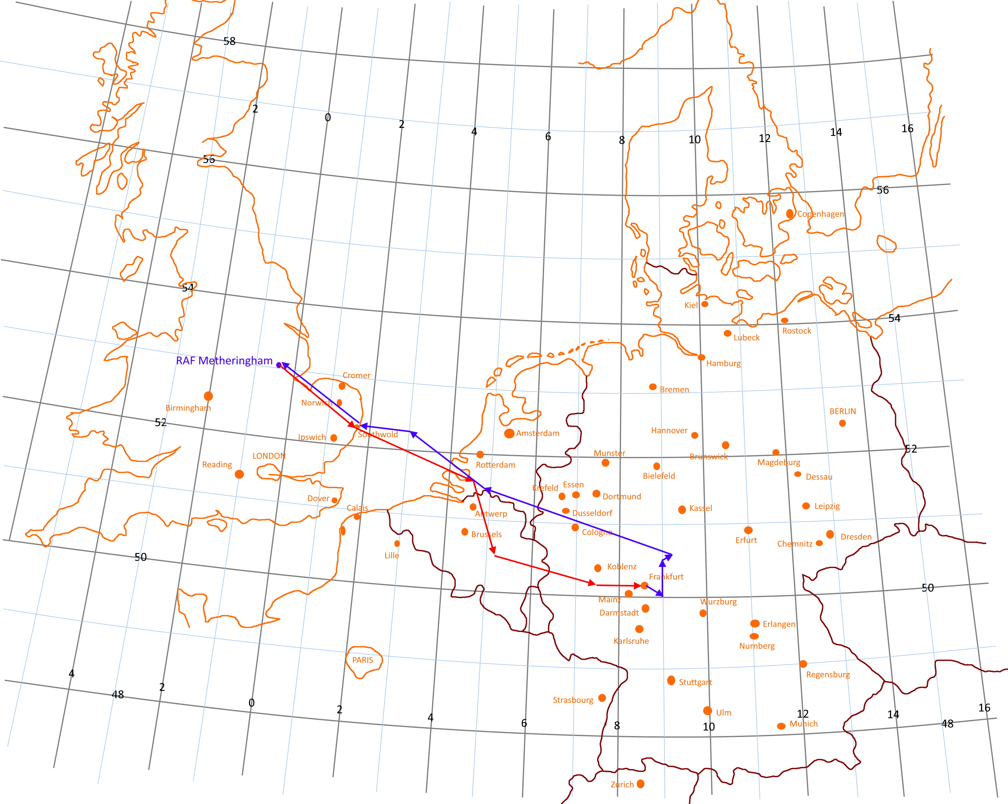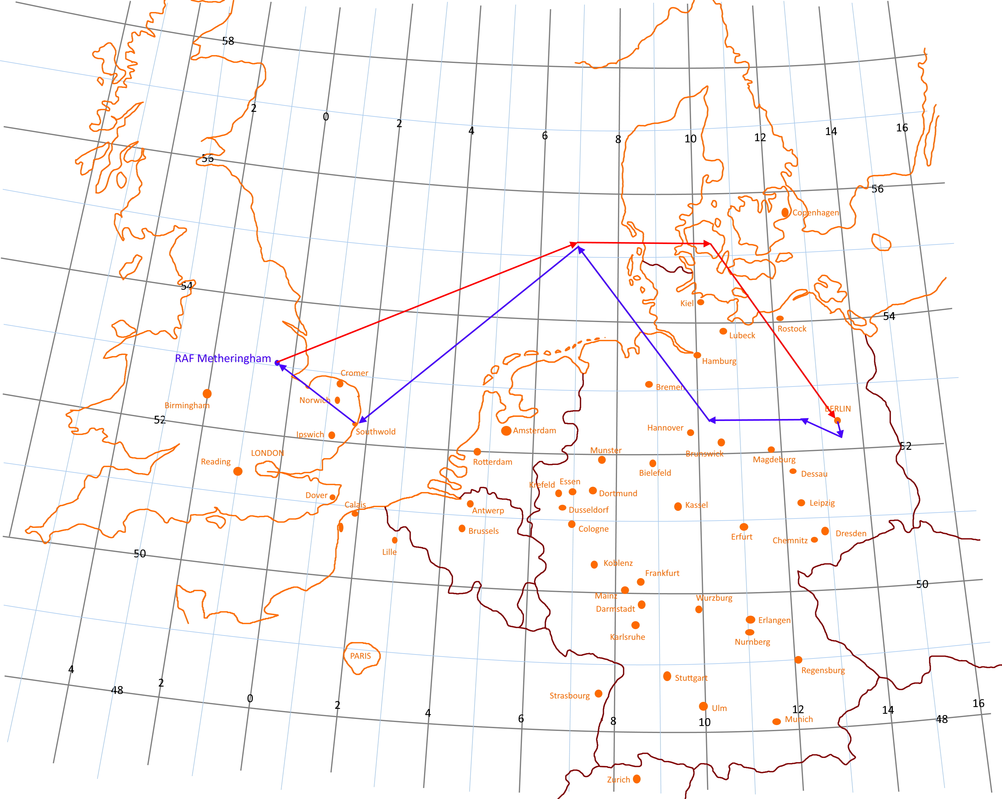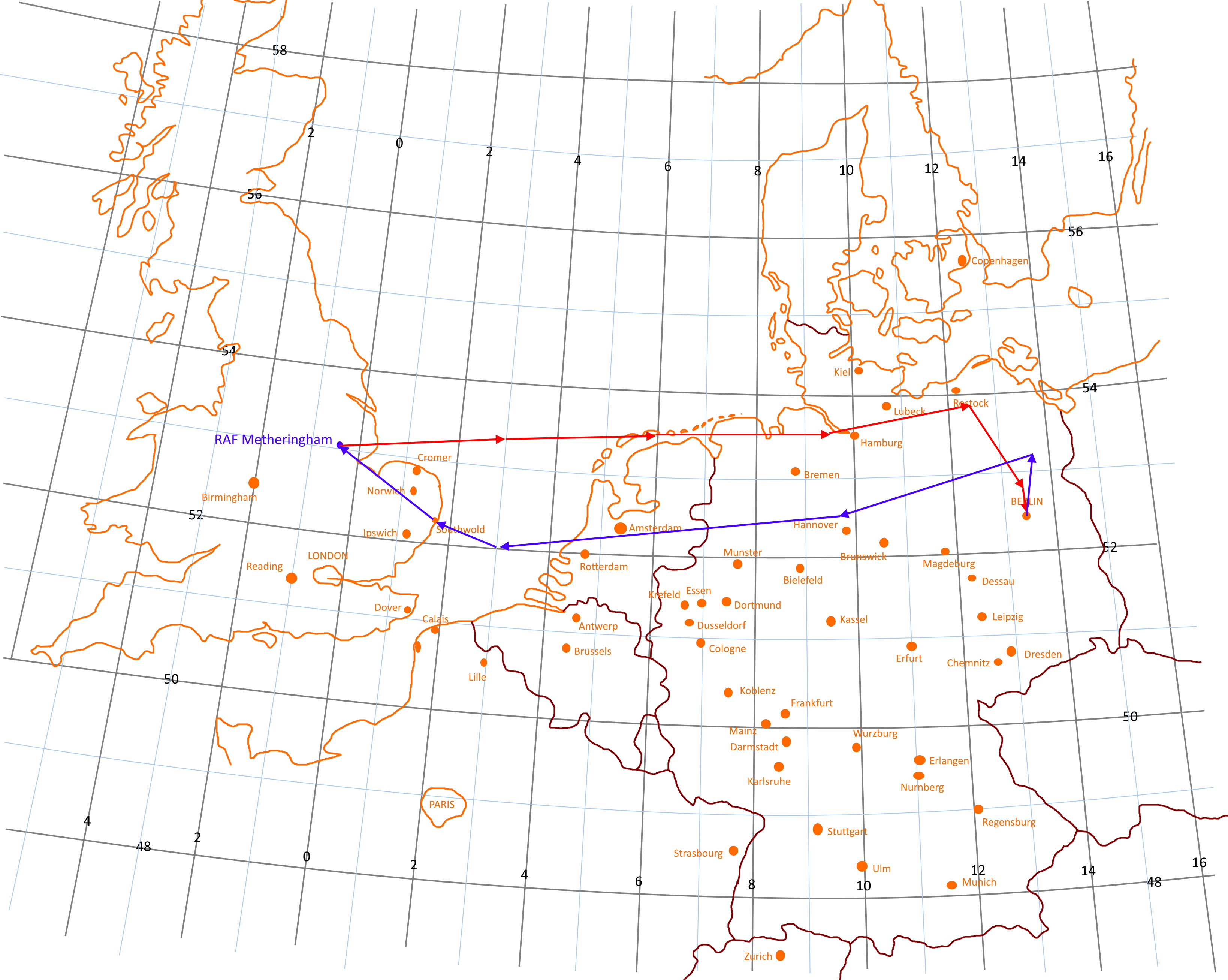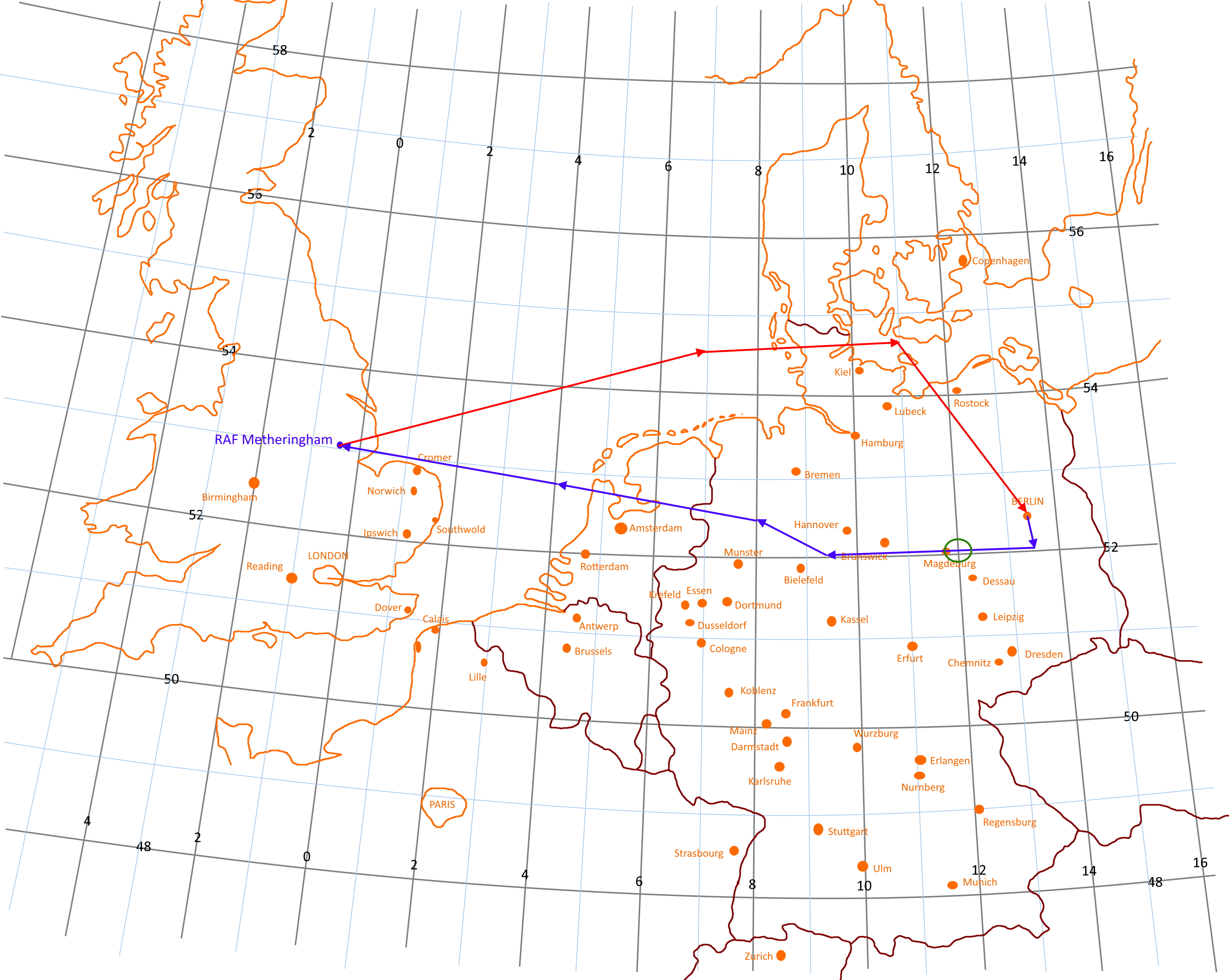 Sergeant John Harrison's first flights with 106 squadron took place in the first few weeks of December 1943. He flew on the 9th December for 1 hour and 15 minutes in Lancaster ZN-P practicing circuits and landing at the airfield in Metheringham. Then on the 10th training continued with bombing practice and an exercise homing using 'Gee'. On the 11th they flew practice cross country exercises. 2 hours 40 minutes in daylight flying using H2S from Metheringham to Norwich, Stoke, Cambridge and back to base; and then at night an exercise of 5 hours 10 minutes, again using H2S from Metheringham to Yeovil, Douglas, Cambridge and back to base. A further daylight cross country route from base to Peterborough, Bradford, Carlisle and home on the 13th December, was then followed by a fighter affiliation training exercise on the 18th December. The crew were then ready for their first operational mission.